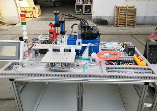 本裝置的實(shí)訓(xùn)工作臺(tái)為鋁合金型材組合而成,臺(tái)面上安裝有上料、傳送、沖壓加工、夾緊、 鉆孔加工、分揀、入料槽等,并配有液壓系統(tǒng)、氣壓系統(tǒng)、變頻器及繼電器控制、PLC等