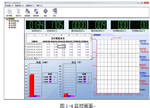 4.1監(jiān)控系統(tǒng):監(jiān)控系統(tǒng)主要完成顯示充電電壓、充電電流、功率、運行狀態(tài);顯示蓄電池電壓、蓄電池放電電流、負載電壓、負載電流各種參數(shù)保護、實時數(shù)據(jù)顯示與處理、對用戶提供權(quán)限管理、密碼登錄等。
