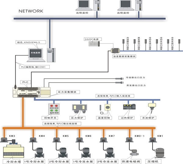 制冷機(jī)組、冷卻系統(tǒng)、冷凍系統(tǒng)、制熱系統(tǒng)、模擬客房、模擬大廳、電控柜、可編程控制器、壓力采集模塊、溫度采集模塊、數(shù)據(jù)采集點、PLC編程軟件、中央空調(diào)組態(tài)監(jiān)控軟件、計算機(jī)、小推車。