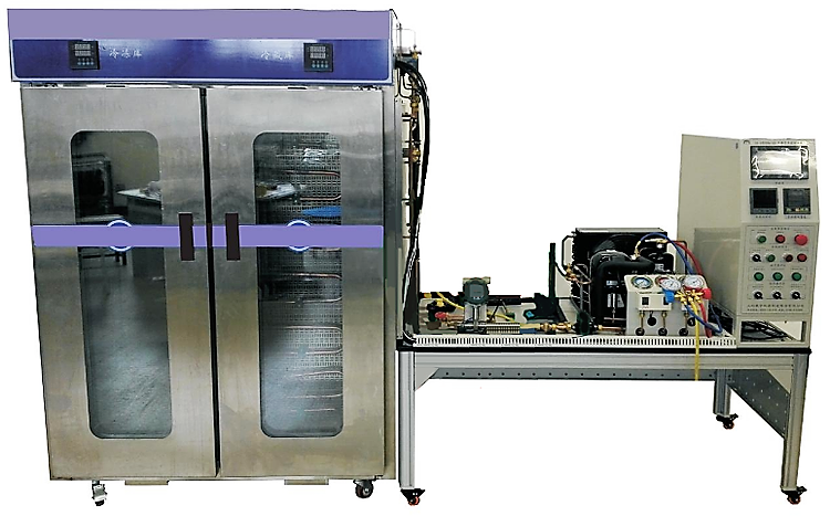 現(xiàn)代制冷裝調(diào)技術(shù)綜合實(shí)訓(xùn)考核設(shè)備由冷庫庫體、操作臺(tái)、制冷系統(tǒng)和電氣控制系統(tǒng)組成一個(gè)雙溫冷庫裝置,設(shè)備各部分結(jié)構(gòu)及組件要求如下:
