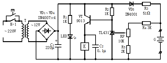 將待充電池G裝入電路,按一下按鍵開關(guān)SB,220V交流電經(jīng)變壓器T降壓,VD1~ VD4整流,輸出約12V直流電壓。由于此時(shí)電流G電壓較低,TL431內(nèi)部驅(qū)動(dòng)管截止,三極管VT基極為高電平,VT導(dǎo)通,繼電器K得電吸合,其常開接點(diǎn)K-1閉合,對(duì)電路進(jìn)行自鎖。此時(shí)12V直流電經(jīng)二極管VD5及電阻R3向電池G充電,同時(shí)充電指示燈LED點(diǎn)亮發(fā)光。改變電阻R3的阻值,可以調(diào)節(jié)電池充電電流的大小。隨著充電不斷進(jìn)行,電池兩端電壓不斷上升,TL431的基準(zhǔn)電壓端電位也隨之上升,當(dāng)升至2.5V時(shí),內(nèi)部驅(qū)動(dòng)管導(dǎo)通,將三極管VT的基極鉗位在低電平,VT截止,繼電器K失電釋放,接點(diǎn)K-1跳開,切斷整個(gè)電路的電源,LED熄滅,表示充電結(jié)束。若要改變電池組G所充的額定電壓的大小,只需調(diào)整電位器RP的阻值。