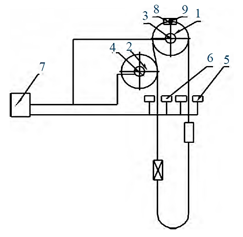 1—摩擦輪;2—導(dǎo)向輪;3、4、9—傳感器;5、6—制動(dòng)機(jī)械手;7—PLC 控制系統(tǒng);8—絞車制動(dòng)閘