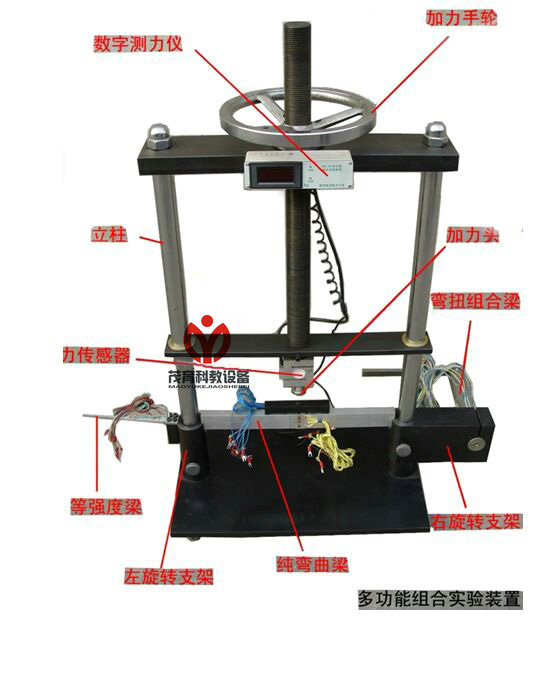 7、多功能組合實驗裝置由立柱、底盤、加力手輪、力傳感器、數(shù)字測力儀、加力頭、左右旋轉支架(裝有定位鎖緊螺母),等強度試驗梁,純彎曲實驗梁,彎扭組合實驗梁,溫度補償塊等組成。