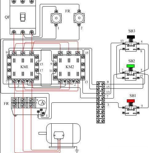 二、反向啟動(dòng):1、合上空氣開(kāi)關(guān)QF接通三相電源2、按下反向啟動(dòng)按鈕SB2,KM2通電吸合并通過(guò)輔助觸點(diǎn)自鎖,常開(kāi)主觸頭閉合換接了電動(dòng)機(jī)三相的電源相序,這時(shí)電動(dòng)機(jī)的相序是L3、L2、L1,即反向運(yùn)行。