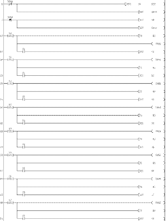84 STL S9 85 OUT Y001 86 OUT Y002 87 OUT Y003 88 OUT Y004 89 OUT Y005 90 OUT Y006 91 OUT Y007 92 OUT T9 K10 95 LD T9 96 SET S10 98 STL S10 99 OUT T10 K10 102 LD T10 103 SET S11 105 STL S11 106 OUT Y001 113 OUT T11 K10 116 LD T11 119 RET |